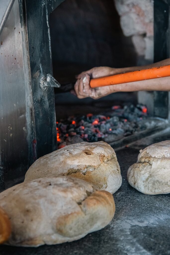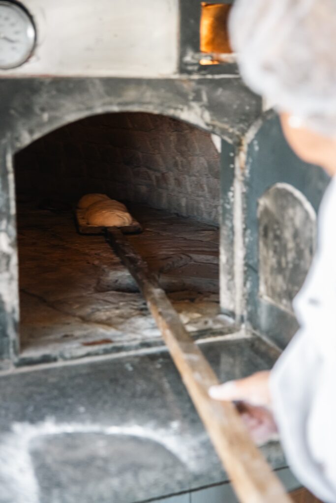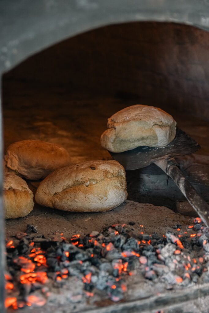O nosso forno de lenha não é decorativo — é o coração da Mathilde. Acende-se de madrugada, todos os dias, e é ele que dá ao pão a crosta estaladiça, a côdea dourada e o aroma que se sente da rua. Não há substituto.
